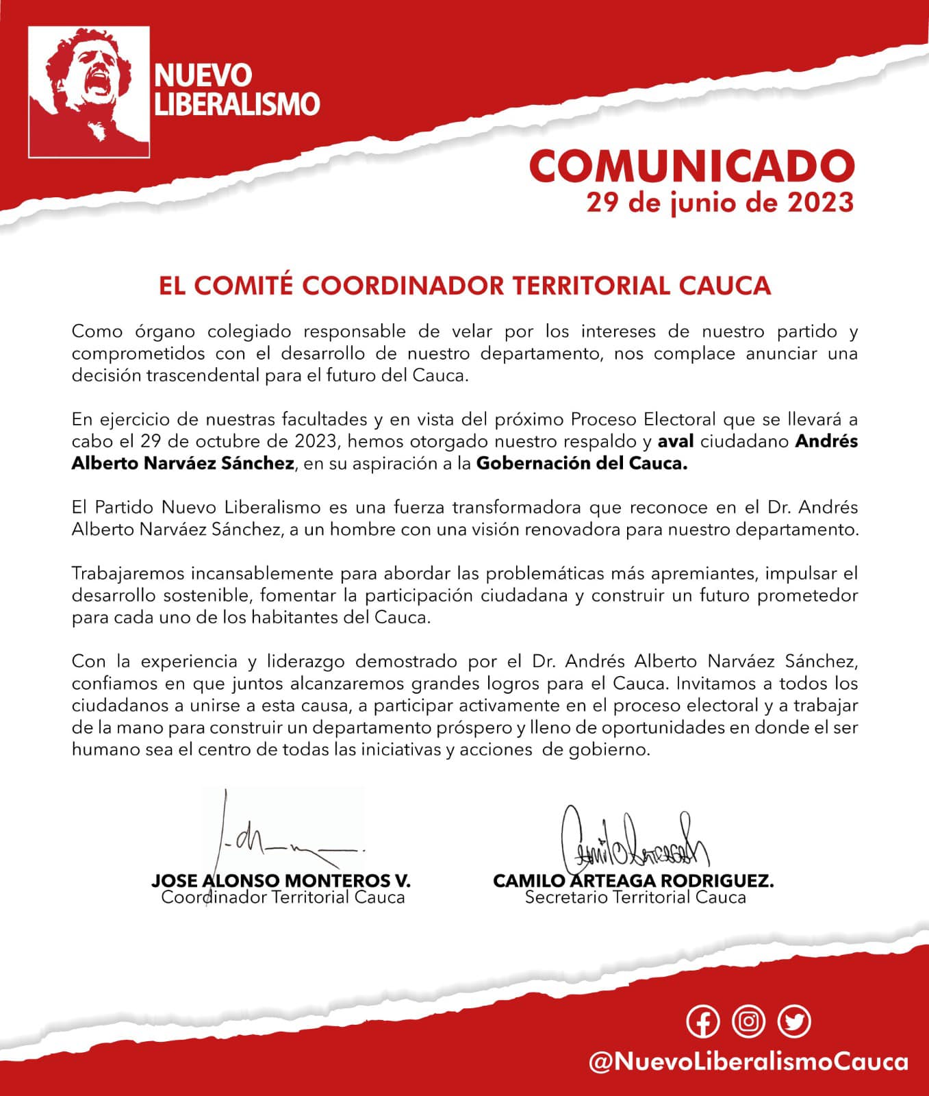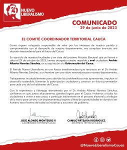 Por medio de sus redes sociales los miembros del Nuevo liberalismo anunciaron que hacia el mediodía de este jueves el Galanismo le entregó su aval para disputar la Gobernación del Cauca.